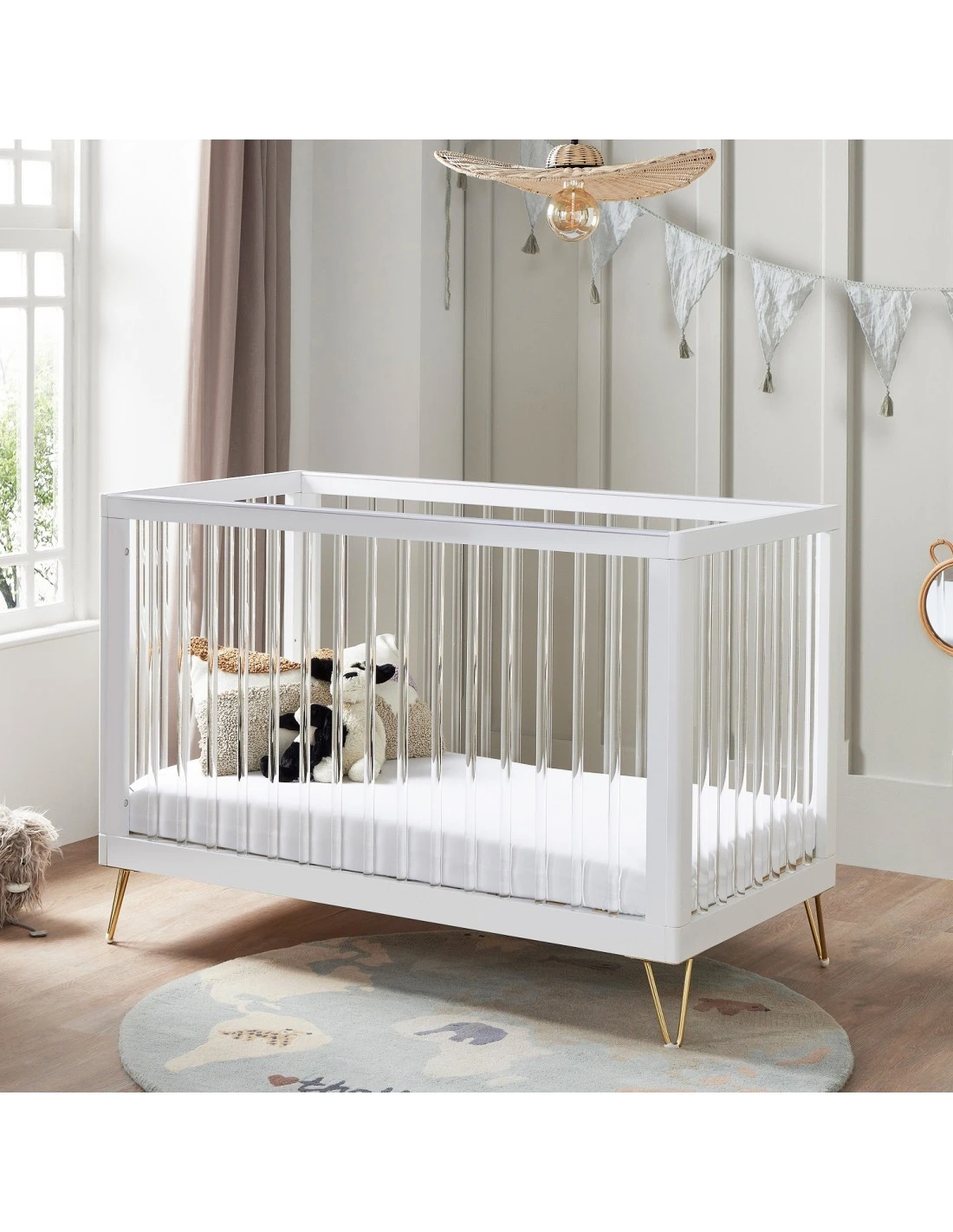 The Scandi-inspired cot bed has been stylishly designed with retro hairpin legs.