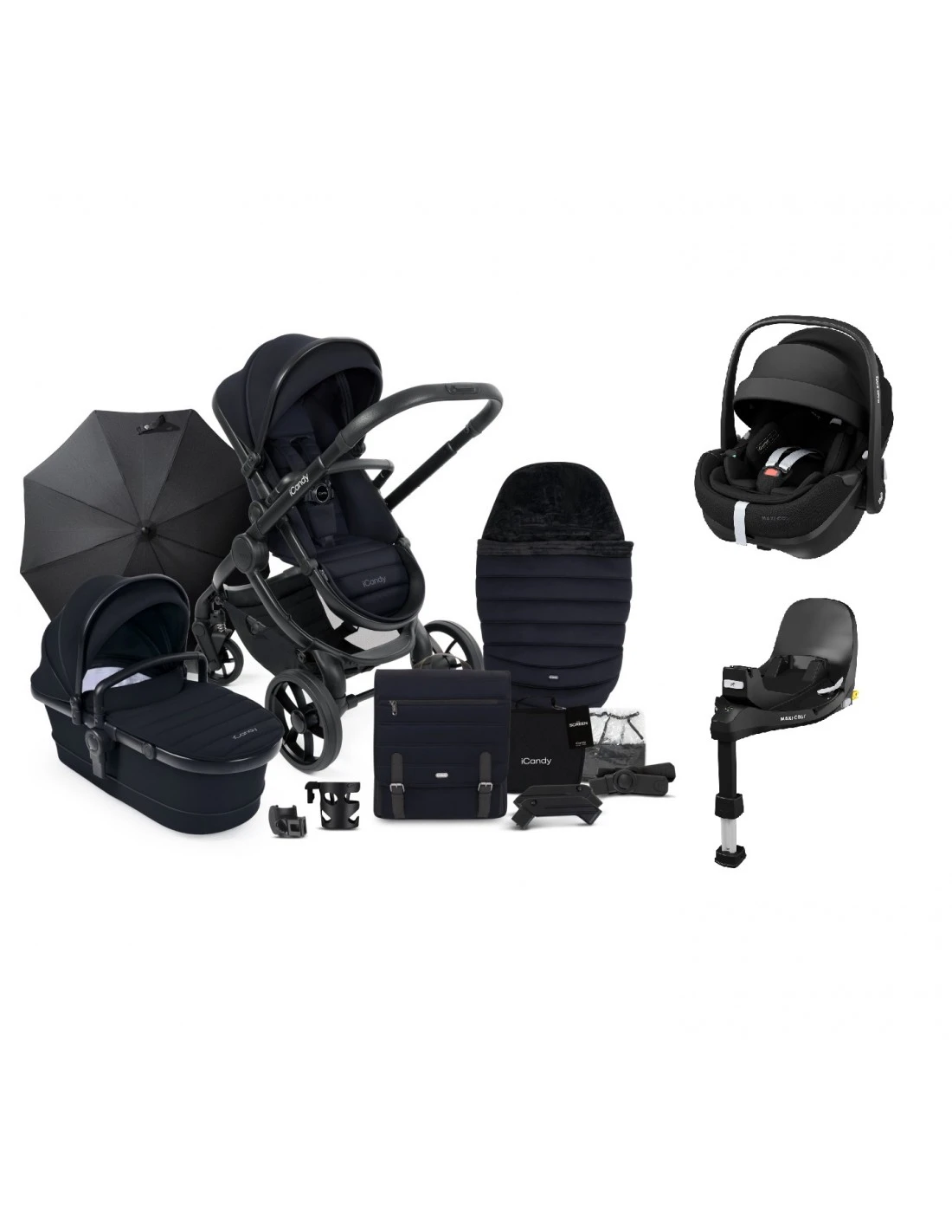 Peach chassis, carrycot fabric, seat unit fabric, carrycot/seat unit frame, canopy, mattress liner, basket, raincover, elevators, car seat adaptors, bumper bar, peach bag, footmuff, the screen, peach clamp, cup holder, parasol, Maxi-Cosi Pebble 360 Pro Car Seat & Maxi-Cosi FamilyFix 360 Pro IsoFix base.