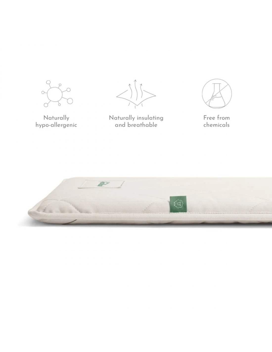The core is then wrapped in a layer of natural Wool. Wool brings an abundance of benefits to your little sleeper, it’s naturally Hypo-allergenic and temperature regulating with excellent breathability. Itās also a natural defence against dust mites and a natural fire retardant, meaning that Green Sheep mattresses pass the UK and European Fire Regulation Tests without the need of any chemical fire retardant sprays.