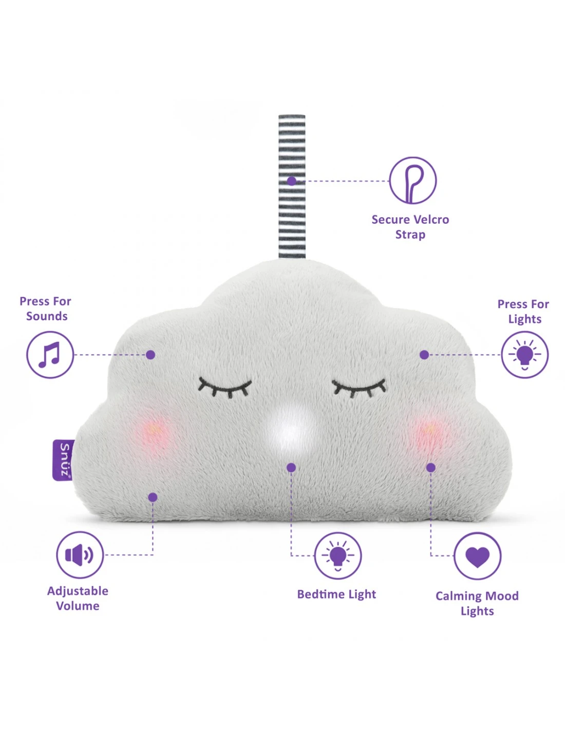 The lightweight cosy design and handy Velcro strap makes SnüzCloud the ideal sleep buddy for use on a cot, crib or when out and about, easily attaching to your pram and car seat.